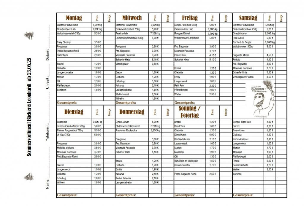 Unser Sortiment umfasst eine Vielzahl von Brotsorten, die täglich frisch gebacken werden. Dazu gehören klassische Sorten wie Roggenbrot, Dinkelbrot und unser beliebtes Weizenmischbrot. Darüber hinaus bieten wir spezielle Brotsorten wie unsere französischen Baguettes oder mediterrane Focaccias an, die besonders für Genießer gedacht sind. Wir achten darauf, dass jedes Brot eine lange Teigführung durchläuft, um besten Geschmack und Bekömmlichkeit zu gewährleisten. Einige unserer Brotsorten wechseln je nach Saison, um immer frische und saisonale Zutaten zu verwenden. Für detaillierte Informationen zu unserem Sortiment schau Dir gerne unseren Wochenplan auf der Webseite an.