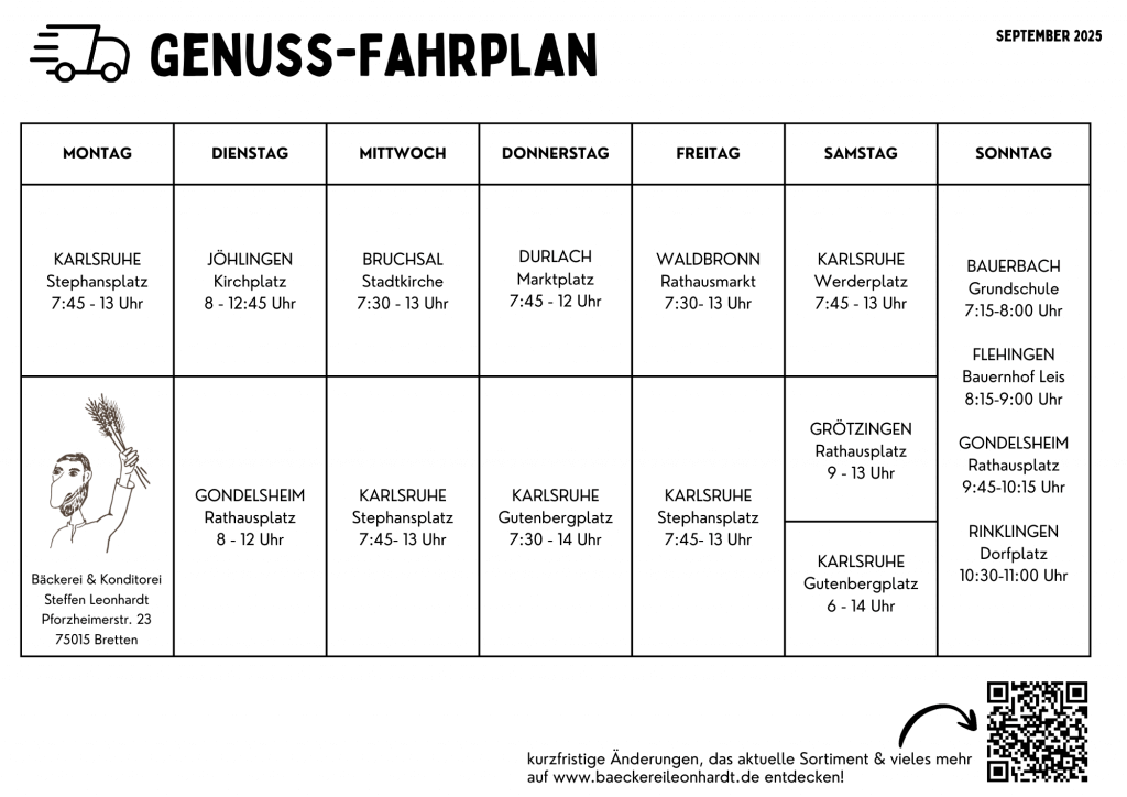 Unser Verkaufsmobil bringt täglich frische Backwaren direkt in Deine Nähe. Besuche uns an verschiedenen Standorten in der Region und genieße unser handgemachtes Sortiment. Ob Brote, Brötchen oder süße Leckereien – wir bieten Dir die gleiche Qualität wie in unserem Hauptgeschäft in Bretten. Schau in unseren Genussfahrplan, um zu erfahren, wo und wann Du uns finden kannst!